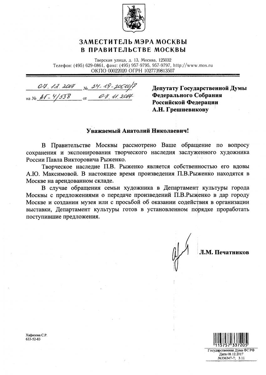Недавно в Вашем журнале была публикация о сложной ситуации с творческим наследием заслуженного художника России Павла Викторовича Рыженко. По этому вопросу мной было направлено письмо в мэрию Москвы с просьбой обратить на это внимание и найти приемлемый и для близких художника, и для правительства Москвы вариант решения.