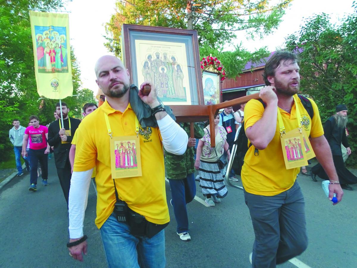 После литургии начинает формироваться колонна. Посланцы Общества «Двуглавый орёл» в желтых майках, с высоко поднятыми хоругвями очень выделяются на общем фоне – не потеряешься. «Откуда вы, такие жёлтенькие?» – спрашивают нас. Вокруг – священники, монахи, волонтёры в ярких красных майках, сербы в национальной одежде, казаки, старики, дети… Паломница из Омска с чувством рассказывает, что их приход с марта начал путешествие по знаковым местам, связанным с царской семьёй, – они уже побывали в Могилёве, на станции Дно, в Царском селе, в Тобольске.