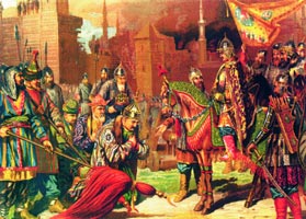 К величию и славе Российская держава прошла долгий и тяжелый путь, путь у истоков которого стоит святой благоверный князь Александр Невский. В темные годы ордынского ига он и его ближайшие наследники заложили основы православной русской государственности, вместе со святителями и подвижниками Православия создавали оплот Святой Руси. На этом пути русские люди одержали в Куликовской битве свою первую победу над Ордой. Спустя сто лет, в 1480 году, иго было сброшено окончательно. Свет Святого Православия рассеял тьму, покрывавшую некогда Русь. В XVI век Московская держава вступила в сознании своей священной миссии как Третий Рим - Православная Империя, преемница Византии. Молодой государь Иван Васильевич стал первым русским царем (1547 г.). Его коронация в Успенском соборе Московского Кремля была актом, утверждающим эту преемственность.