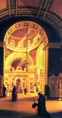 Во время службы в храме чувствуешь себя по-иному. Вокруг - люди. Братья и сестры, прихожане. Ровно идет служба, хор дружно вторит иерею. Л кончилась служба, в храме вновь тишина. Только замах ладана и треск догорающих свечей. Изредка кто-то войдет, поставит свечи к образам.