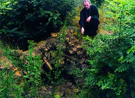 Отец Никон прочитал в пещере несколько молитв, мы испили святой воды из источника и начали спускаться вниз. На обратном пути наткнулись на полуразрушенный мраморный памятник. Надпись на нем не сохранилась, но отец Никон предполагает, что это памятник настоятелю Кизилташского монастыря игумену Парфению, убитому татарами. Около этого памятника произошло чудо: один из сержантов воинской части перед демобилизацией решил сделать подкоп под фундамент монумента с надеждой найти под ним большие ценности. Для надежности он взял с собой двух солдат с саперными лопатками. И вот, как только они приступили к гробокопательству, неожиданно из леса вышел богообразного вида старичок. Он подошел к ним и спросил: "А что это вы тут делаете?" Потом, взглянув на саперные лопатки в их руках и на место раскопа, строго сказал: "Прекратите копать и немедленно убирайтесь отсюда!" Солдаты с перепугу даже побросали свои лопатки. Бежали, боясь оглянуться.