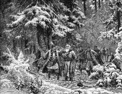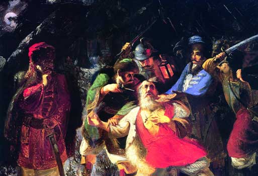 "Челобитчики", посланные за Царем, как и поляки, не знали, где искать его? Направились сначала зачем-то в Ярославль. Польский же отряд, не теряя времени, спешился у избы Ивана Сусанина. Известно было, что он особенно приближенный слуга Романовых. Значит должен знать, где его господин, а не знает сам, так укажет того, кто знает. И Иван Осипович действительно знал, может быть, сам недавно отвозил из Домнина в Ипатьевский монастырь Мишу Романова с матерью. Бог надоумил Марфу Романову укрыть сына в монастыре в это лихое время. Презрительно и свысока, с коней не слезая, разбойники потребовали, чтобы Сусанин указал им, где Миша Романов. Иначе...