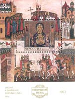 На марке приведён фрагмент иконы с изображением святых прп. Сергия