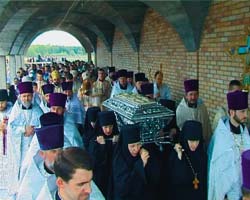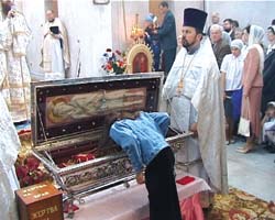 В храме несомая в серебряной раке святыня встречается с Богородичной иконой, которая также чудесным образом не сгорела в пожаре 1746 года.