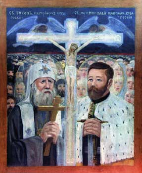 Вся жизнь святого Патриарха Тихона соприкасалась со святым Царём-мучеником. Удручённый тем, что на Аляске, как и в больших городах Америки, под церкви приспособлены простые жилые дома, владыка Тихон, в бытность его служения там, обращается за помощью в Россию и к местным православным жителям. Император Николай II первым отзывается на эту просьбу, и на средства, по- жертвованные им, в Нью-Йорке и Чикаго вскоре строятся православные храмы. В год празднования 300-летия династии Романовых, когда Владыка был на Ярославской кафедре, Государь, Императрица, Наследник и Царевны посетили Ярославль. Он обратился к Всероссийскому Императору со словом приветствия и благословения. Во время войны с Германией Владыка бывал на фронте, и даже под обстрелом. В 1916 г. за труды во славу Отечества Николай II наградил его бриллиантовым крестом для ношения на клобуке. Когда Император томился в Тобольске, Патриарх Тихон смог через Тобольского епископа Гермогена передать ему просфору и благословение. Узнав о зверском убийстве Царя, Патриарх в тот же день собрал совещание Соборного Совета, на котором было решено безотлагательно совершать панихиды по убиенному Царю. В протоколе совещания Святейший написал: "Благословляю архипастырей и пастырей молиться о сем на местах". А через два дня, в праздник явления Казанской иконы Божией Матери, он произнёс проповедь, ставшую исторической, - с обличением безбожных убийц Императора. Это было началом прославления Царственных мучеников. Так идут они к встрече друг с другом в вечности у Креста Христова. К той встрече, которая запечатлена на иконе, написанной по откровению свыше.