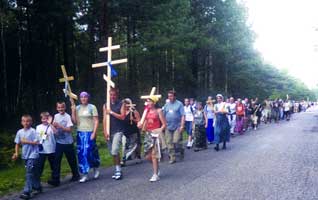 А в августе нам довелось принять участие в пешем паломничестве Белосток - Грабарка. Оно проходит ежегодно вот уже двадцать лет. Паломники проходят за шесть дней 140-160 км, неся кресты, которые потом устанавливают около монастырской церкви. Там стоит уже лес крестов. В каждом храме по пути служатся молебны. День начинается литургией, заканчивается вечерней службой. Ночуют в домах у местных жителей. На Преображение Грабарку посещает до 50 тысяч православных верующих. Служат четыре литургии: в два часа ночи, в четыре, в семь и в десять часов утра. Причащают из двенадцати чаш. Священники всю ночь исповедуют желающих. Конечно, участие в таком крестном ходе незабываемо.