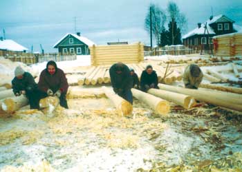 от Суры. Сёстры сами готовят брёвна для неё, а рабочие делают сруб.