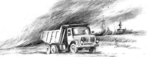 Женя резко остановил свой разогнавшийся грузовик. Едва не наехал он на Странницу. Решил выйти и посадить