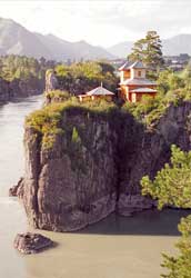 Примерно через полчаса мы достигли вершины горы, тропинка устремилась вниз, и вскоре мы оказались на зеленой лужайке на высоком берегу Катуни, перед воротами Чемальской женской общины. Ворота были гостеприимно открыты, и за ними с замиранием сердца мы увидели, как из пучины бурлящей горной реки скалистыми уступами поднимался остров, с берега к нему был переброшен узкий подвесной мост. На острове из зелени выступали башенки деревянной церкви. Это и был Патмос с храмом во имя Иоанна Богослова.
