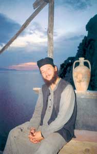Монах-карулиот делает замечание: не прижимайся к скале, иди прямо. Ногу ставь аккуратно, но уверенно,