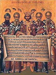 Святые отцы обнаружили на партах перед собой куски пергамента с новой редакцией текста Символа Веры, являющегося изложением самой сути христианства. Слова Символа Веры непременно произносил перед крещением любой становившийся христианином в зрелом возрасте, крещённые в младенчестве проходят его на одном из первых уроков Закона Божьего.