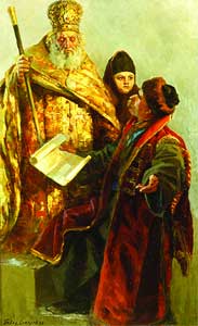 В уста Патриарха Нового Рима Иеремии в Уложенной грамоте влагается следующая речь: "Воистину в тебе, благочестивом царе (имеется в виду занимавший тогда царский престол сын Ивана Грозного Фёдор - В. Ц.) Дух Святый пребывает, и от Бога сицевая мысль тобою в дело произведена будет, праве и истинно вашего благородия начинание, а нашего смирения и всего Освященного собора того превеликого дела свершение. Понеже убо ветхий Рим падеся Аполинариевою ересью, вторый же Рим, иже есть Константинополь, агарянскими внуцы от безбожных турок обладаем, твое же, о благочестивый царю, великое Российское царство, третей Рим, благочестием всех превзыде, и вся благочестивыя царствие твое в едино собрася, и ты един собрася, и ты един под небесем христьянский царь именуешися в всей вселенней, во всех христианах, и по Божию Промыслу и Пречистыя Богородицы милости и молитв ради новых чюдотворцов великого Российского царства Петра и Алексия и Ионы, и по твоему царскому прошению у Бога, твоим царским советом, сие превеликое дело исполнитца".
