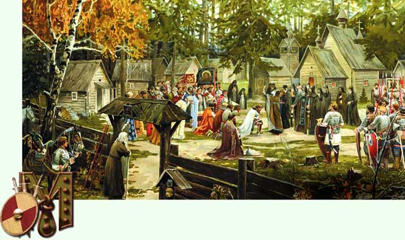 Только так мы можем понять, почему великий исторический момент в жизни русского народа - свержение татаро-монгольского ига - связан с именем преподобного Сергия. Святые отцы сравнивают его с Моисеем, вождём богоизбранного народа, который был послан Богом для русских православных людей, чтобы избавить их от иноплеменного рабства. Мы помним, как он осенил крестным знамением святого благоверного князя Димитрия Донского, когда орды Мамая угрожали полным уничтожением русской земли. Преподобный Сергий благословил его на знаменитую Куликовскую битву, сказал ему: "Иди, князь, без страха. Господь, Пресвятая Троица поможет тебе против нечестивого врага". И добавил: "Ты победишь". В помощь Великому князю Преподобный дал двух иноков своей обители - схимонаха Андрея (Ослябю) и схимонаха Александра (Пересвета). Старшие и более опытные князья и военачальники советовали благоверному князю Димитрию подождать немного, не торопиться, потому что Мамай был силён, его поддерживала Литва и другие союзники. Однако, приняв благословение Преподобного, благоверный князь Димитрий не внял их увещаниям. Он пересёк со своим войском Дон, путь назад был отрезан, оставался один путь - вперёд. Победа или смерть. Всё русское воинство, ободряемое благословением преподобного Сергия, молилось перед сражением, помня его слова о том, что ныне готовится много мученических венцов. А во время сражения Преподобный молился со всей братией в храме. Он видел, как идёт сражение, и называл имена павших, вознося молитвы об их упокоении. И, наконец, возвестил: "Победа наша".