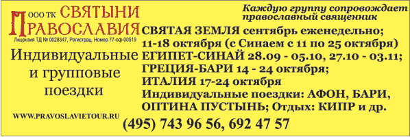 Еженедельно в Дивеево, Оптину пустынь, Годеново, Серпухов, а также Псков, Новгород, Петербург, Селигер, Муром, Киев и многие другие поездки к cвятыням России и зарубежья.