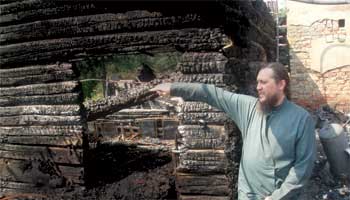 Отец Владимир открывает со скрипом высокие железные ворота, на нас пахнуло гарью. А ведь со дня пожара прошло уже более месяца. Перед глазами - страшная картина.