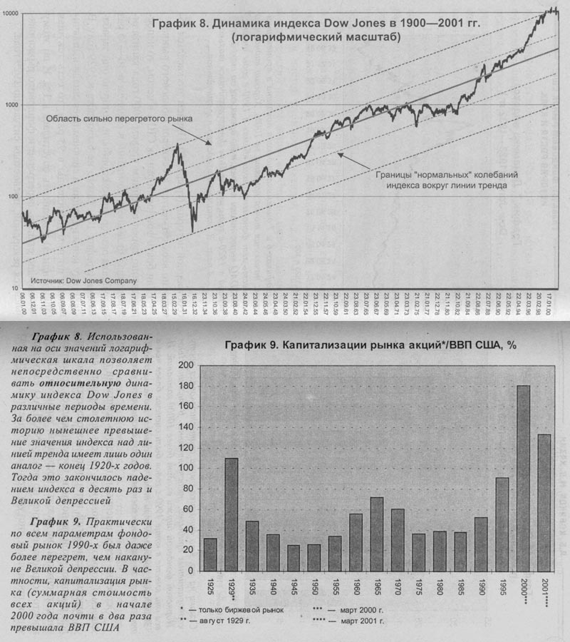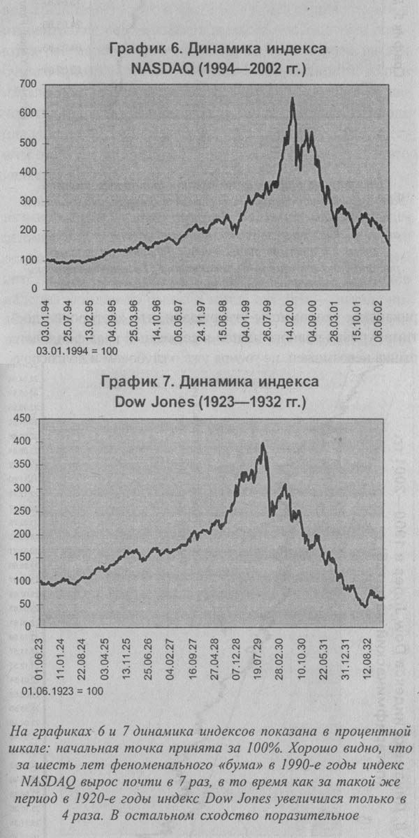 Простое сопоставление динамики индекса Dow Jones в 1920-1930-х годах и поведения рынка NASDAQ в последнее десятилетие совершенно ясно указывает на то, что "весенняя распродажа" 2000 года на Уолл-стрит была ни чем иным, как самым настоящим биржевым крахом. Такое сопоставление вполне корректно, поскольку входящие в NASDAQ компании играют сегодня роль "двигателя" американской экономики, каким в свое время были компании, входившие в Dow Jones.