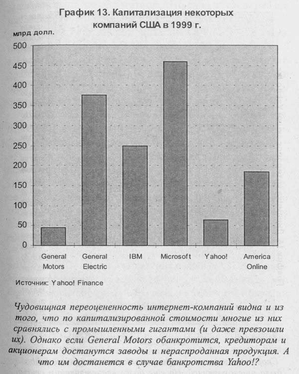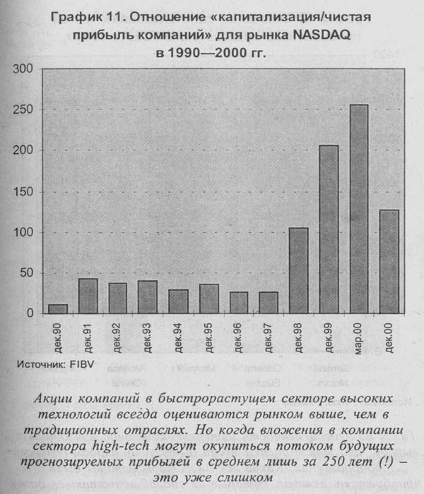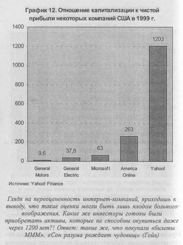 Уже к декабрю 2000 года суммарная рыночная капитализация шести гигантов "новой экономики" - Microsoft, Intel, Cisco Systems, WorldCom, Dell Computers и Oracle - упала по сравнению с максимальным значением более чем на 1,2 трлн долларов. Всего же в результате трехлетнего падения фондового рынка "сгорело" уже не менее 8,5 трлн долларов фиктивного богатства. Это одно из свидетельств начавшегося "возвращения к реальности". Однако большинство высокотехнологичных компаний все еще очень переоценено. Среднее отношение капитализации компаний к чистой прибыли для рынка NASDAQ, даже после его драматичного падения, все еще превышает 80 раз. При этом имеются компании, для которых соотношение "цена/прибыль" по-прежнему достигает 400 и более раз.