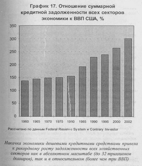 Потребительский кредит рос со скоростью 9,8% в год. Дешевый кредит привел к невиданному расцвету массовых спекуляций на фондовом рынке с использованием маржевых операций. Конечно, дешевый потребительский кредит создавался не с целью перегрева фондового рынка. Но какой соблазн! При стоимости кредита 8% годовых вполне можно было взять взаймы у банка или брокера и, покрутив деньги, с их же помощью на фондовом рынке заработать 20-30% в год. На самом деле заработать можно было больше, используя операции с кредитным рычагом. Размер кредитного плеча, несмотря на существующее формальное ограничение в 50% от стоимости приобретаемых активов, можно было многократно увеличить при помощи фьючерсных контрактов на фондовые индексы. В начале 2000 года общий объем операций с кредитным плечом исчислялся в США несколькими сотнями миллиардов долларов.