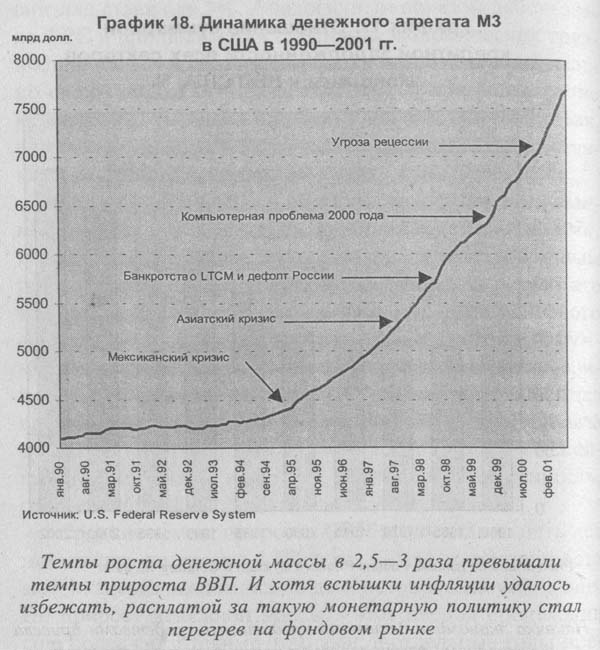 Средние темпы прироста ВВП за последние пять лет находились на уровне 4,5% в год - таких темпов роста американская экономика не демонстрировала уже давно. Но прирост денежной массы в этот период происходил еще более гигантскими темпами, в отдельные годы превышавшими 10% в год. Почему же избыточная денежная масса не вызвала вспышки инфляции? Дело в том, что львиная доля прироста кредитных денег шла на фондовый рынок, способствуя неоправданно быстрому его подъему. Вместо инфляции на потребительском рынке имела место инфляция финансовых активов.