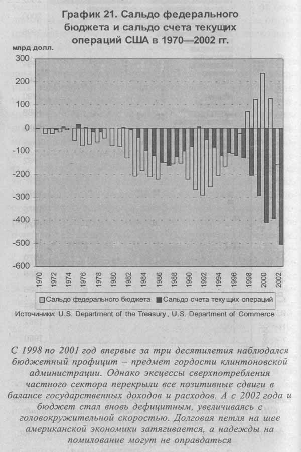 В начале 1980-х США выходили из кризиса через резкий рост государственных расходов. Такой была концепция "рейганомики" - гонка вооружений, наращивание государственного оборонного заказа, благодаря чему удалось в довольно короткие сроки смягчить проблему безработицы. Усиление госвмешательства после тяжелейших кризисов середины и конца 1970-х было совершенно естественным реактивным шагом. Для того чтобы обеспечить финансирование широкомасштабных государственных расходов, правительство широко использовало схемы госзаимствований, выпуская долгосрочные казначейские обязательства под очень высокий процент (до 14-18% годовых). Из этих средств и финансировался госзаказ. В результате госдолг к началу 1990-х вырос до 5 триллионов долларов.