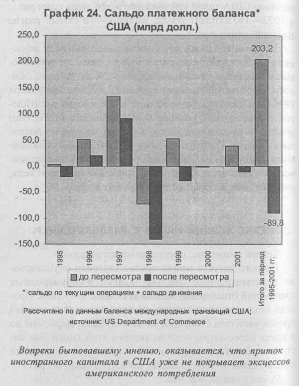 Второго августа министерство торговли опубликовало пересмотренные данные баланса международных транзакций (платежного баланса) США с 1995 года. Проведя нехитрые вычисления, то есть сопоставив чистый приток капитала с дефицитом по текущим операциям до и после пересмотра, один из авторов этой книги был настолько потрясен результатом, что вначале не поверил своим глазам и перепроверил расчеты несколько раз.